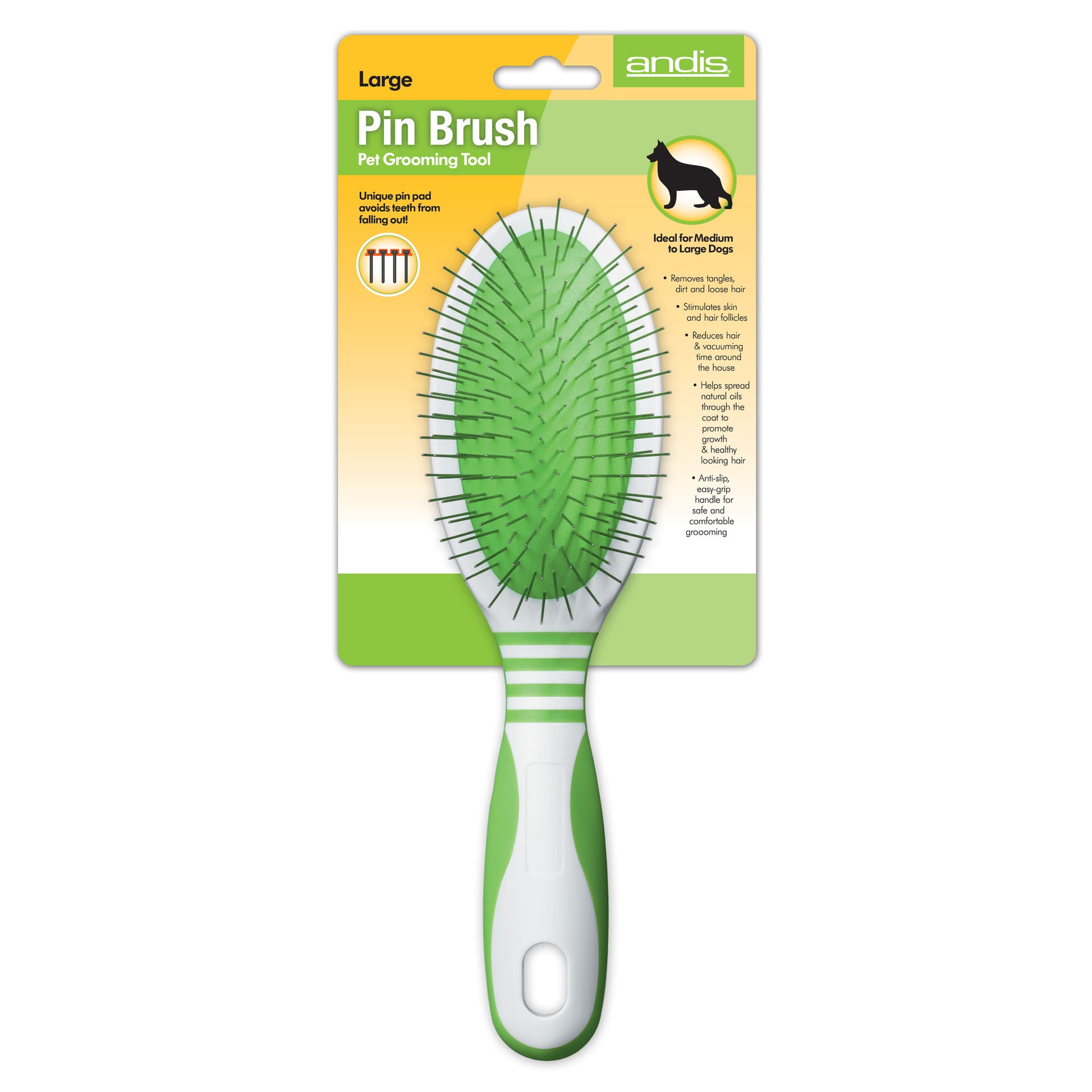 The Andis Large Pin Brush is specially suited for medium to large dogs with a large head that eliminates tangles, dirt, and loose hair. Advanced flex pad design means fine-toothed, flathead pins stay in place and don’t fall out as they stimulate healthy hair growth and encourage lustrous shine. Brush in comfort with malleable cushioning that contours to the shape and curves of your dog’s body and works through hard-to-reach areas. Turn the simplest groom into a work of art with the Andis Large Pin Brush.
