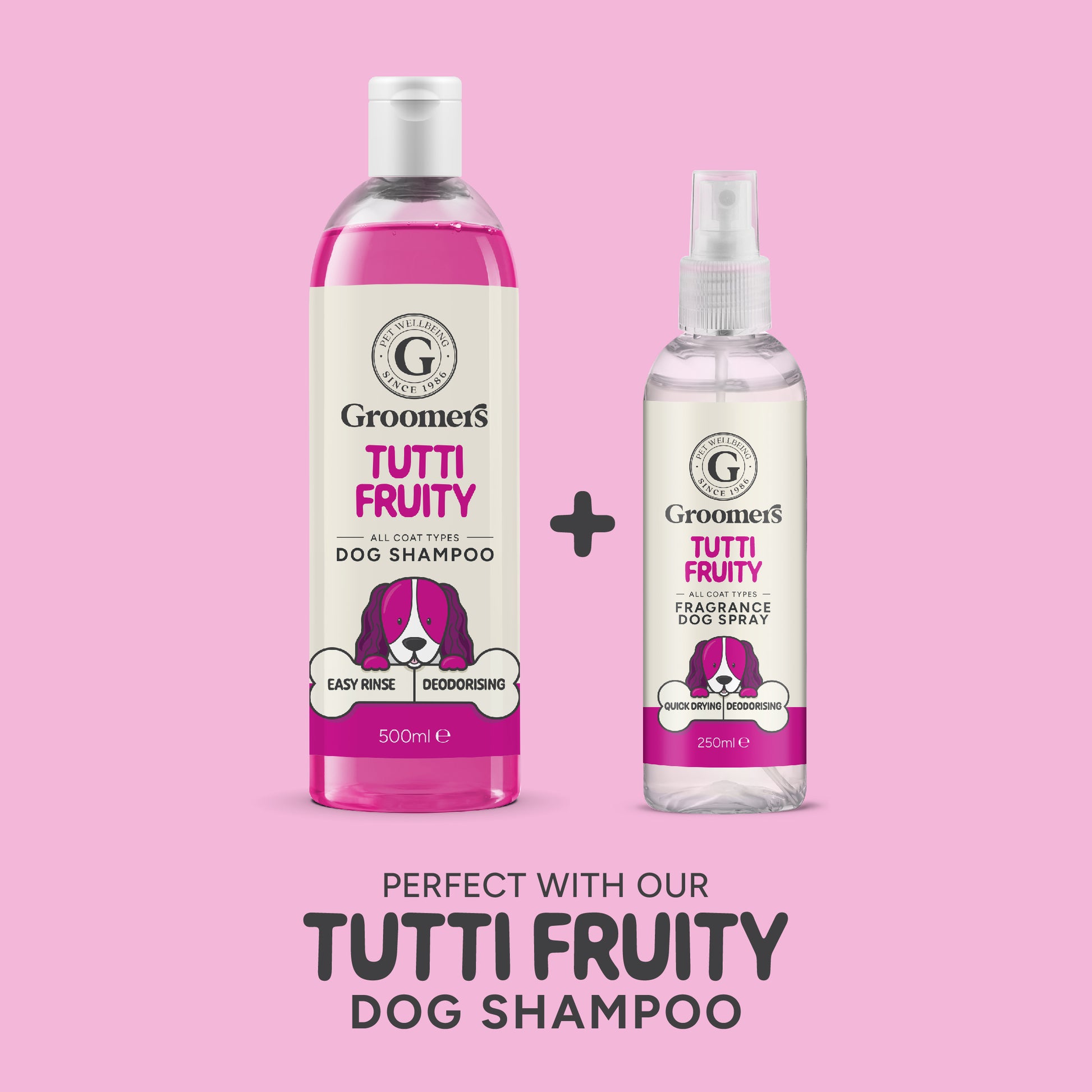 Groomers Tutti Fruity Deodorising Dog Fragrance Spray is deodorising and conditioning leaving your dog's coat smelling gorgeous.